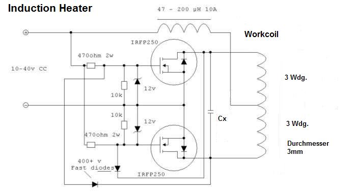 Das Prinzip kann sehr einfach selber nachvollzogen werden. Eine ZVS-Ansteuerung mit zwei MOSFETs speist einen Schwingkreis (Resonanzfrequenz einige 10 bis 100kHz), wobei die Spule dieses Schwingkreises gleichzeitig die workcoil darstellt. Die workcoil muss mit sehr dickem Draht ausgeführt werden, da sie durch die enormen Ströme ebenfalls ziemlich heiss wird. Alle Verbindungen zwischen workcoil, Schwingkreiskondensatoren und Ansteuerung müssen möglichst kurz und dick ausgeführt werden. Nachfolgend das Schema: