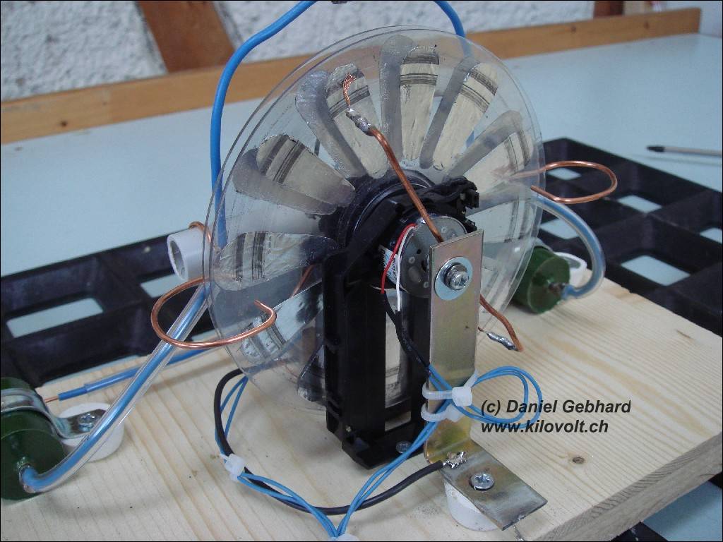 www.kilovolt.chAus aktuellem Interesse an elektrostatischen Maschinen habe ich mich dazu entschlossen, eine ganz kleine Influenzmaschine selber zu bauen. Als Scheiben kommen die unbeschichteten Deckscheiben von CD/DVD-Rohlingen zum Einsatz. Die Entladungen sind mit ca. 8mm nicht gerade eine Sensation, aber der Bau der Maschine hat dennoch grossen Spass gemacht und die Technik dahinter fasziniert mehr als die Entladungen. Für diejenigen, die nur nach den Entladungen streben sei hier gesagt, dass mit praktisch jedem anderen HV-Erzeuger mit weniger Aufwand wesentlich mehr erreicht werden kann.